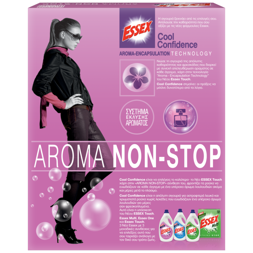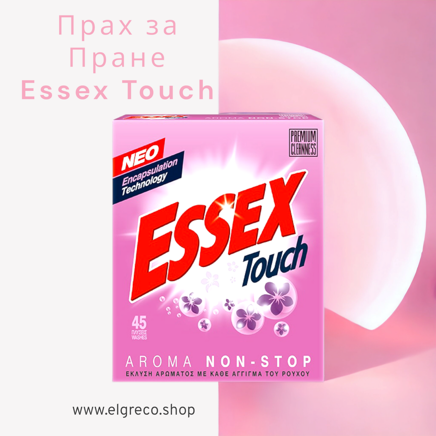Почувствайте сигурността на абсолютната чистота и свежест на новия Essex Touch, който е траен, благодарение на технологията за капсулиране на аромата с непрекъснато освобождаване на аромат при всяко докосване! Новият ESSEX Touch, благодарение на състава си "AROMA NON-STOP", прави дрехите ароматни при всяко докосване с прекрасен флорален аромат дори дни след пране.