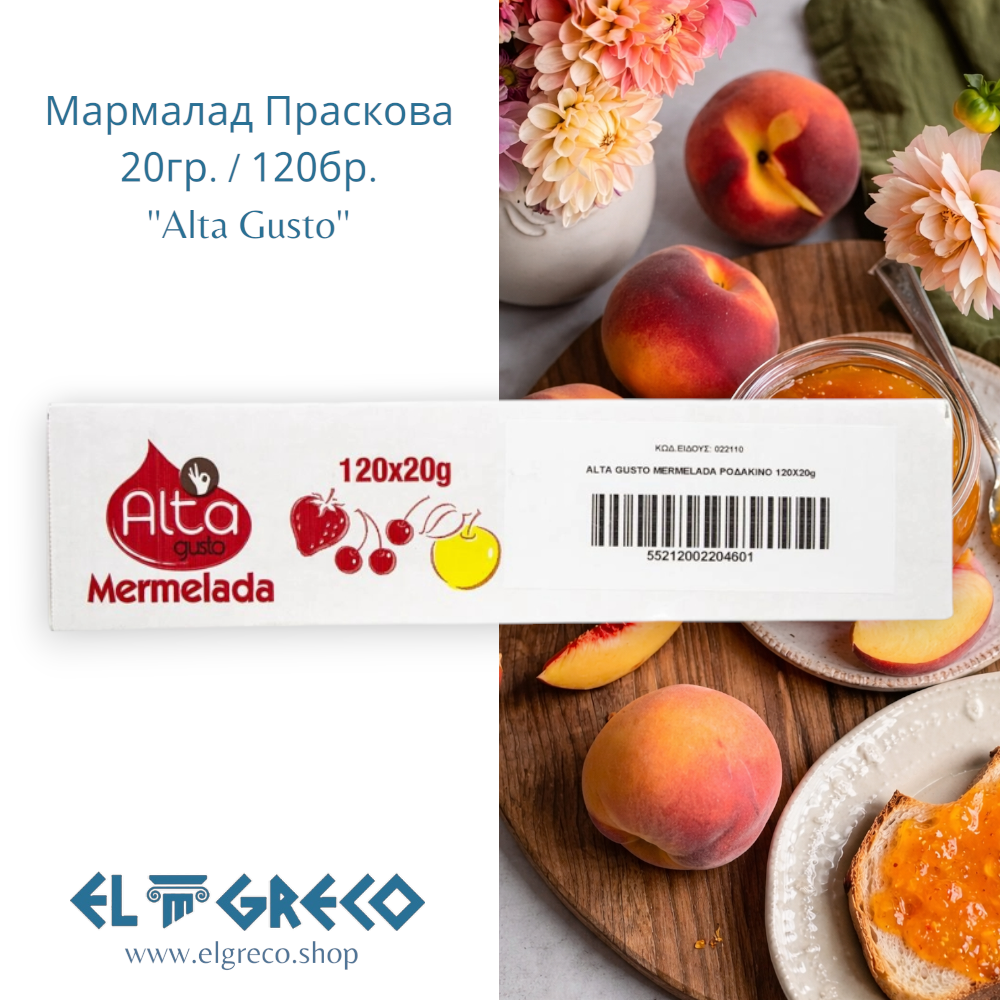 Прасковеният конфитюр Alta Gusto в индивидуални опаковки представлява идеалното и икономично решение за професионалисти в сферата на общественото хранене.