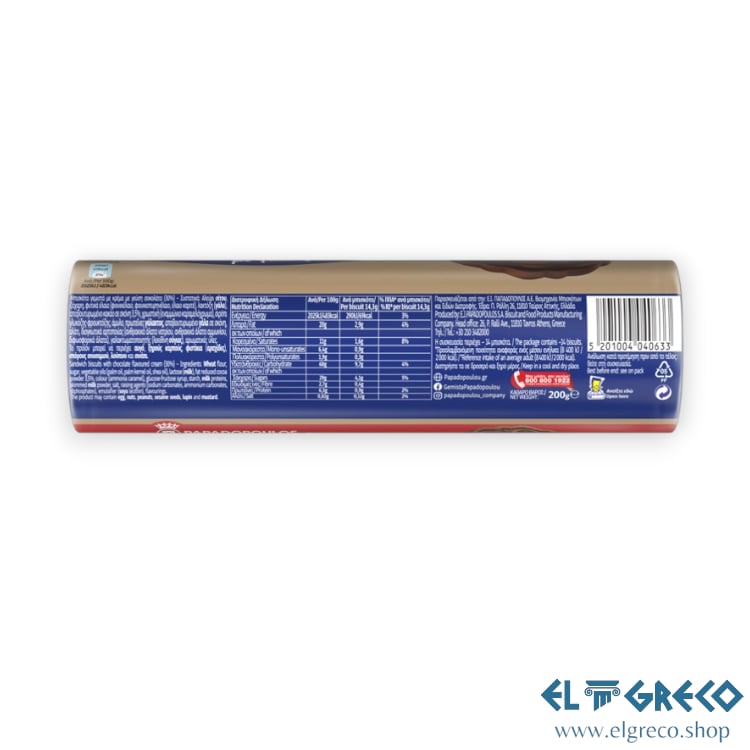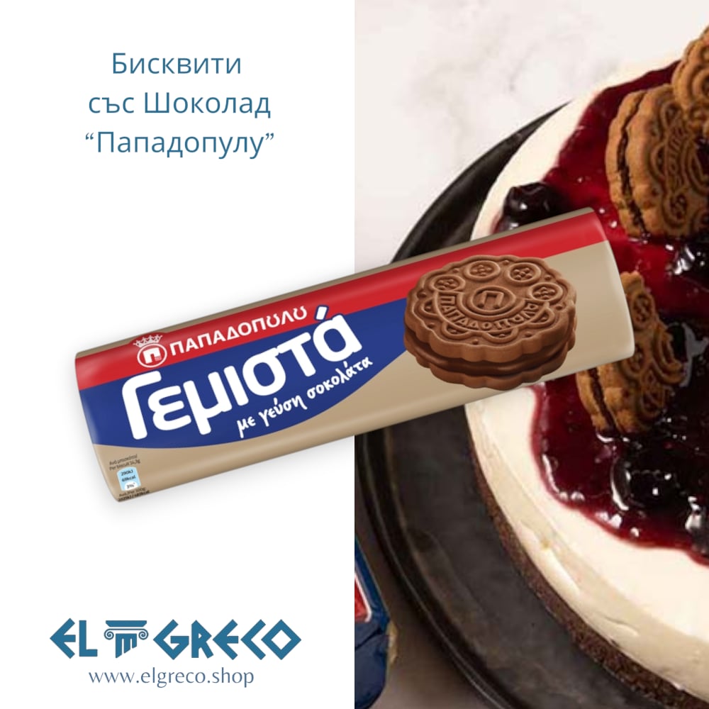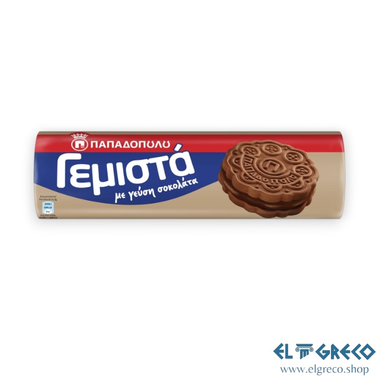 Насладете се на уникалния вкус на оригиналните бисквити „Пападопулу“ с богат и неустоим шоколадов пълнеж. Хрупкави бисквити с нежна текстура, които обгръщат кадифен шоколадов крем – перфектното съчетание на вкус и удоволствие. Идеални за всяко време на деня – с кафе, мляко или като сладка закуска у дома или в офиса.