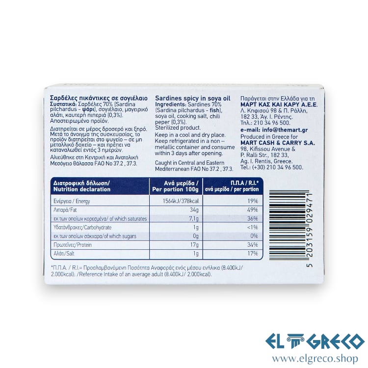 Пикантни сардини, внимателно подбрани и консервирани за директна консумация. Всяка консерва съдържа крехки сардини, комбинирани с люта чушка и растително масло, които придават наситен и пикантен вкус. Продуктът съчетава висока хранителна стойност и отличен вкус, като запазва естествените качества на рибата.