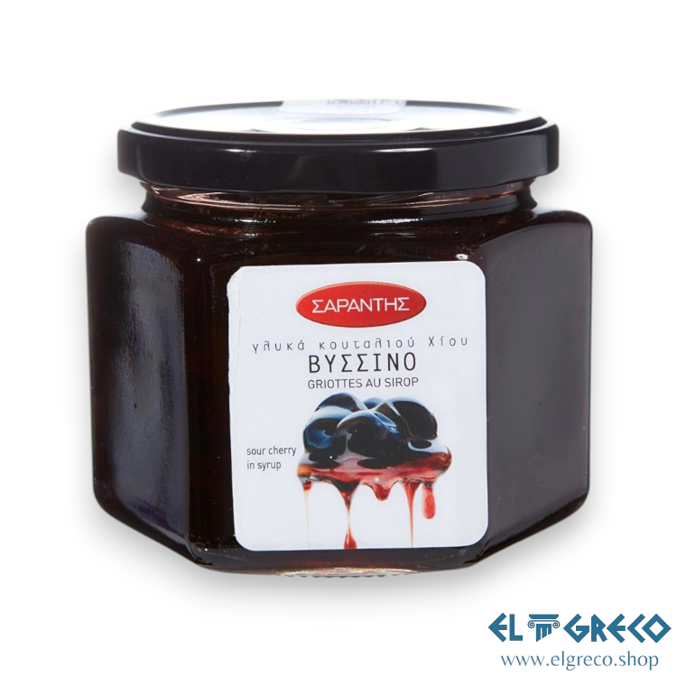Традиционно сладко от вишни Sarantis от остров Хиос – с наситен аромат и приятен балансиран сладко-кисел вкус. Истинско гурме изживяване, подходящо за консумация самостоятелно или като изискан акцент към кисело мляко, сладолед и десерти. Отличен избор както за домашната кухня, така и за професионалната сладкарска практика. Съхранявайте на хладно и сухо място.