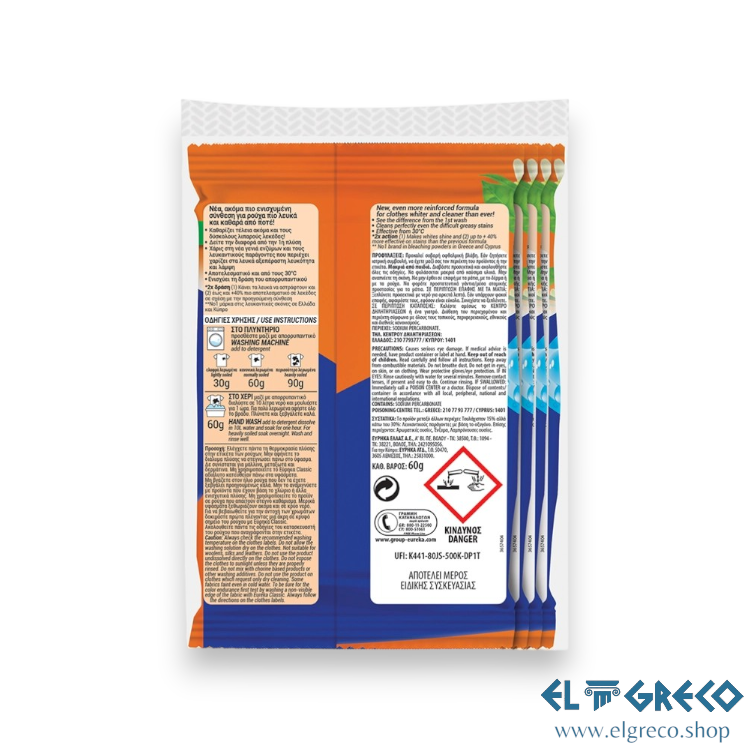Eureka Classic с аромат на портокалов цвят е с нова, по-подсилена формула, създадена за дрехи по-бели и по-чисти от всякога. Благодарение на новото поколение ензими и избелващи агенти, продуктът ефективно премахва дори трудни мазни петна и придава на дрехите изключителна белота и блясък, дори при ниски температури (30°C).