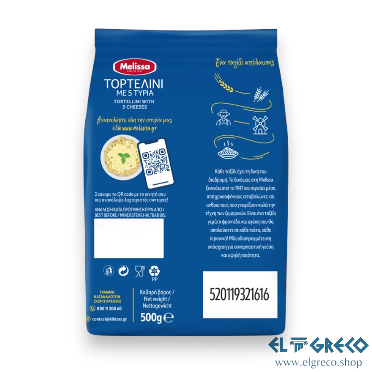 Тортелини с 5 сирена Melissa са изкусителна комбинация от автентичен италиански вкус и гръцко качество. Пълни с пет подбрани сирена – пармезан, рикота, ементал, гауда и крем сирене – те предлагат богат, неустоим вкус и кадифена текстура във всяка хапка.